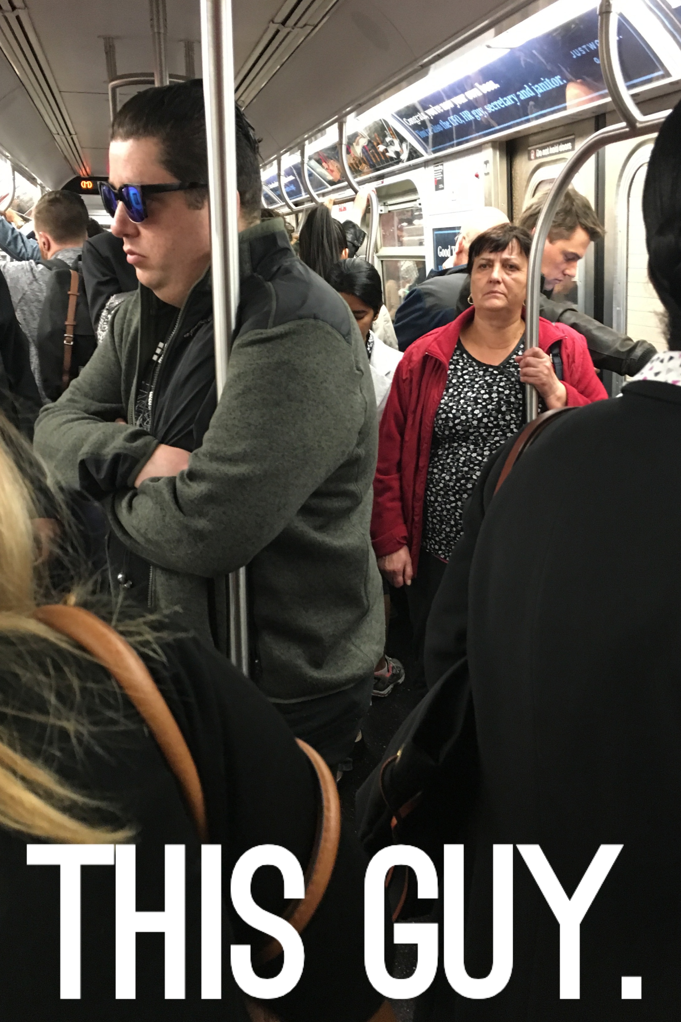 He doesn’t care that the train is packed. He doesn’t care that it’s rush hour. He doesn’t CARE!