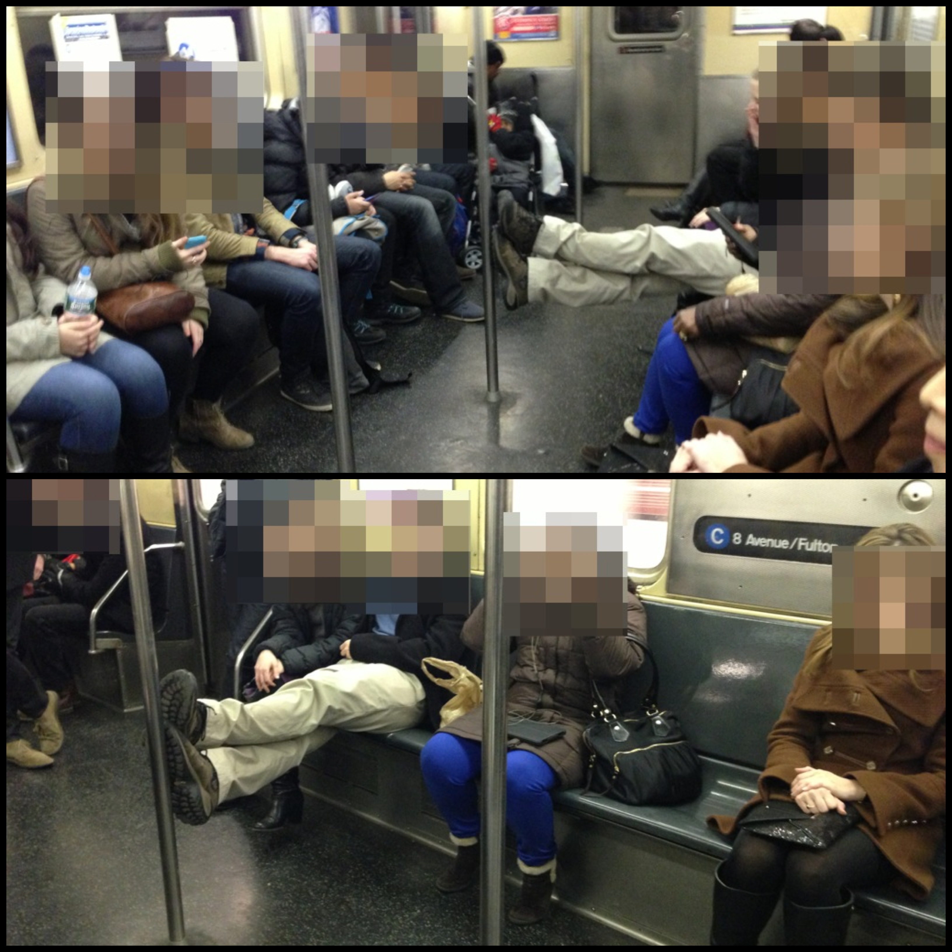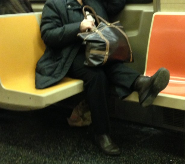 When taking up two seats, one sits pigeon toed for greater effect.
